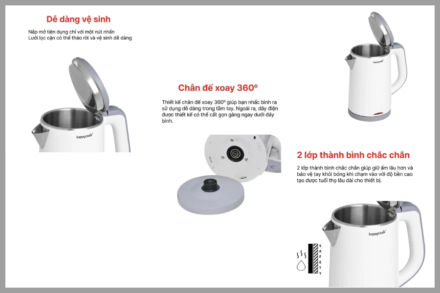Không chỉ dừng lại ở chức năng cơ bản, Ấm siêu tốc Happy Cook HEK-120PW còn được cải tiến về thiết kế và tính năng nhằm mang lại trải nghiệm tốt hơn cho người dùng. Từ kiểu dáng đến chất liệu, tất cả đều hướng đến sự an toàn và tiện dụng.