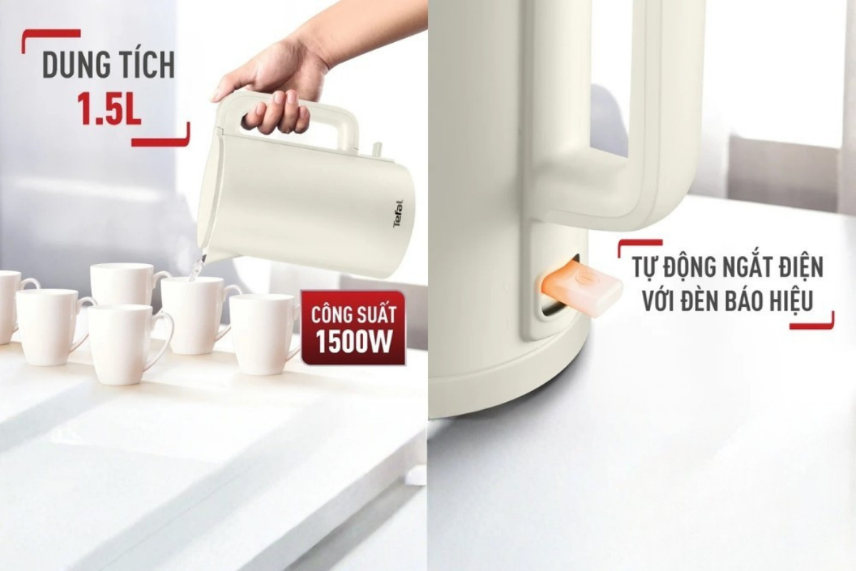 Ấm Siêu Tốc Tefal KO140AE0 1.5L với công suất mạnh mẽ 1500W giúp đun sôi nước nhanh chóng, tiết kiệm thời gian tối đa. Dù là nấu mì, pha cà phê hay pha sữa cho bé, bạn đều có thể thực hiện ngay tức thì.