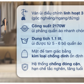 - Công suất 2170W làm nóng nhanh, tiết kiệm thời gian ủi quần áo