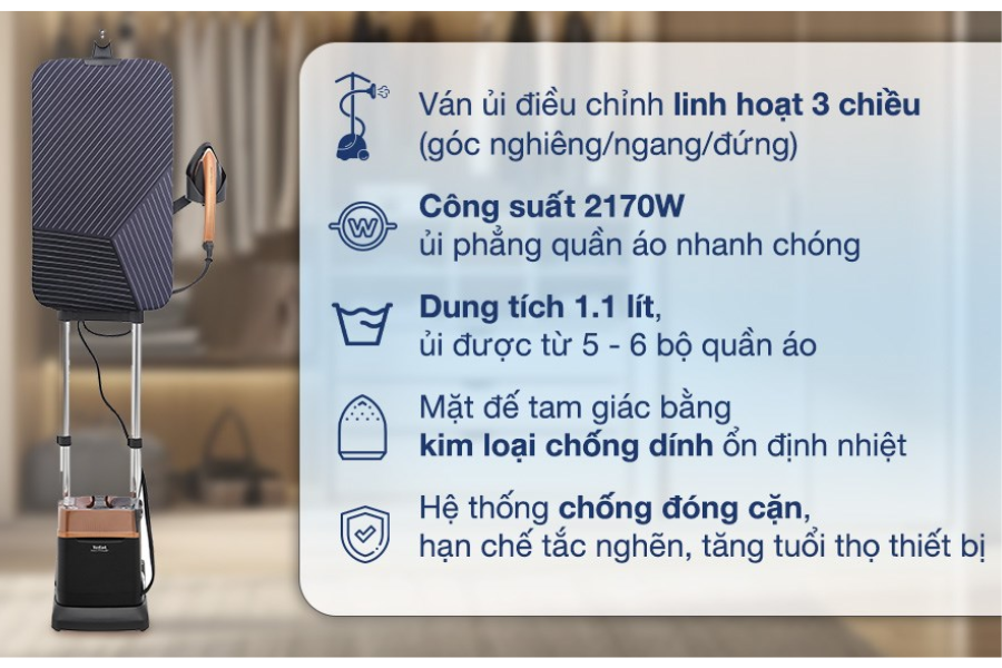 Khác với bàn ủi khô thông thường, bàn ủi hơi nước dạng đứng sử dụng hơi nước nóng để làm mềm sợi vải, giúp quần áo phẳng tự nhiên hơn. Điều này hạn chế nguy cơ cháy xém, đặc biệt với các loại vải mỏng hoặc dễ hư tổn. Tefal QT2020E0 được định vị ở phân khúc tiện ích cao, tập trung vào trải nghiệm sử dụng thực tế thay vì quá nhiều tính năng phức tạp.