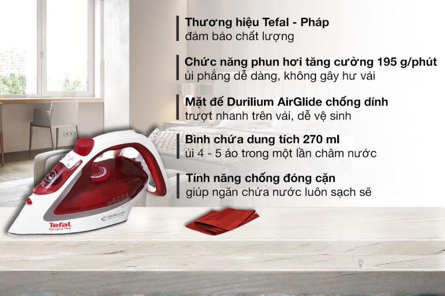 - Bàn ủi có khả năng phun hơi 195g/ phút là phẳng quần áo nhanh chóng