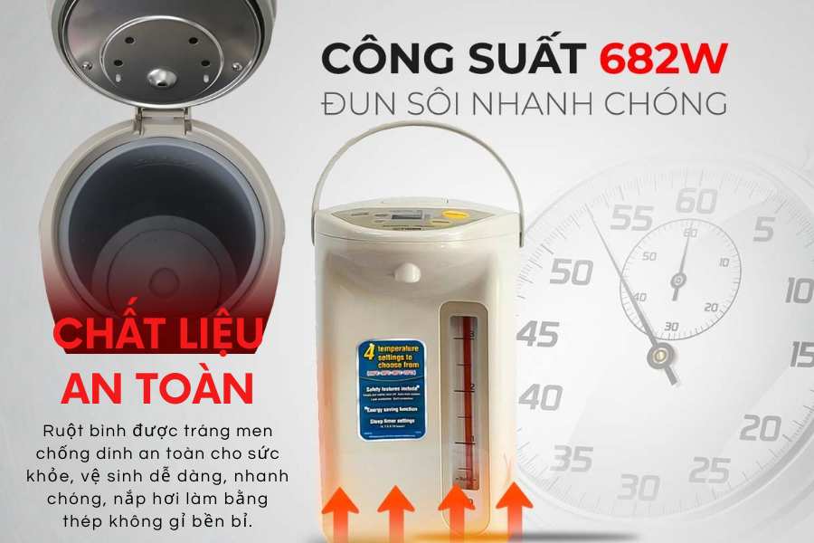 Điều này đặc biệt hữu ích đối với người lớn tuổi hoặc trẻ em khi sử dụng. Nắp bình có khả năng đóng kín tốt, góp phần hạn chế thất thoát nhiệt trong quá trình giữ nóng nước, từ đó nâng cao hiệu quả giữ nhiệt và tiết kiệm điện năng khi bình duy trì nhiệt độ trong thời gian dài.