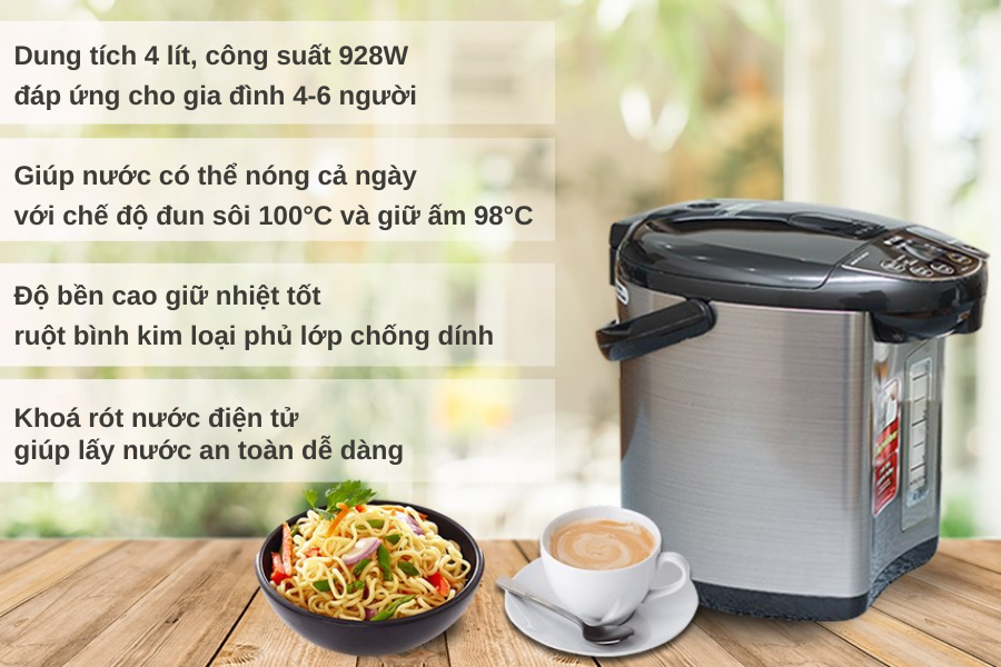 - Bình tự động tắt khi nhiệt độ đạt 98 độ C, tiết kiệm điện