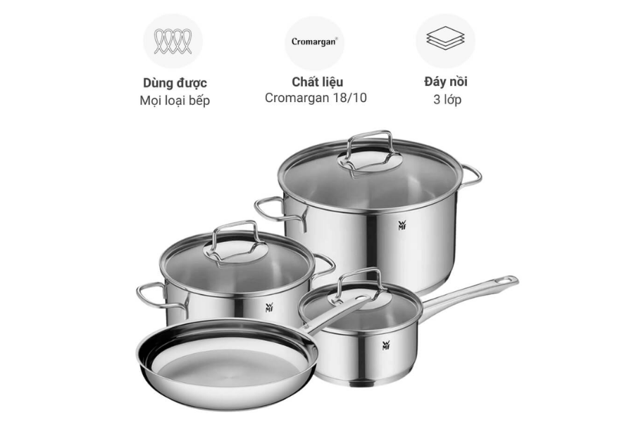 Chất liệu chính được sử dụng trong Bộ nồi inox 4 món WMF là thép không gỉ Cromargan® 18/10 – một dòng inox cao cấp, nổi tiếng bởi độ bền, khả năng chống gỉ sét và chịu nhiệt mạnh. Cromargan® không chỉ giúp nồi bền bỉ theo thời gian mà còn không phản ứng với thực phẩm, bảo toàn dinh dưỡng và hương vị món ăn.