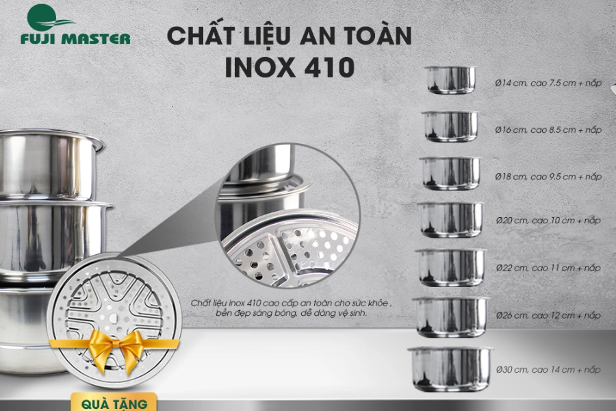 - Bộ nồi inox Fuji Master FJ-FM13 chất liệu inox bền, an toàn