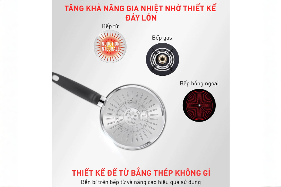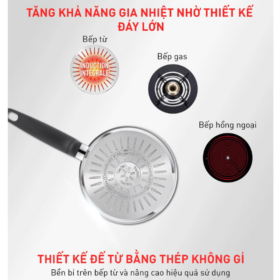 - Thiết kế đáy đặc biệt giúp truyền nhiệt nhanh, đều và sử dụng được trên mọi loại bếp: bếp từ, bếp gas, bếp hồng ngoại.