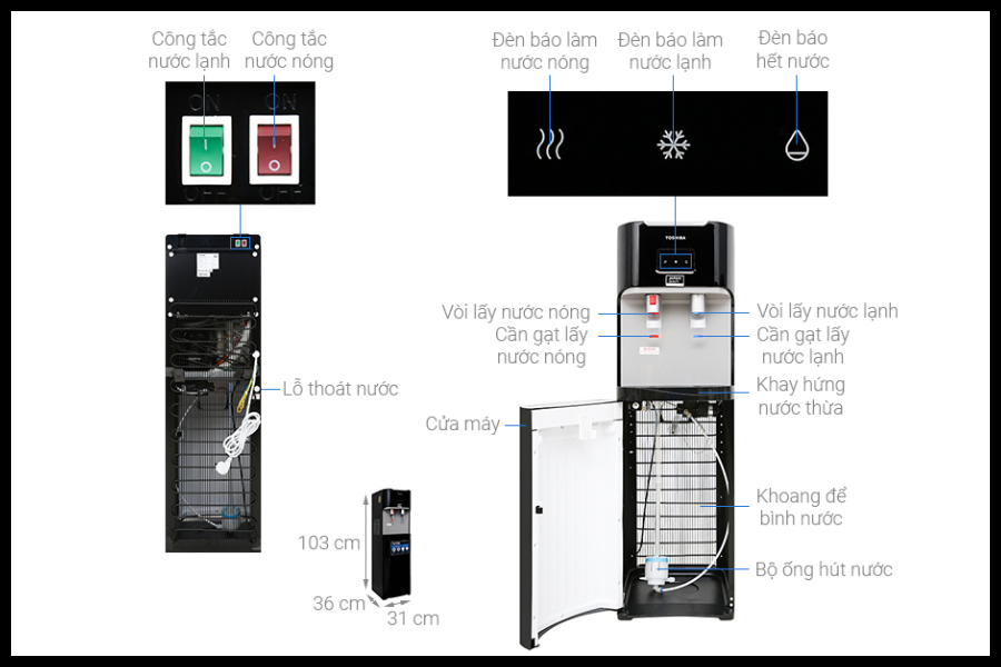 Tất cả những tính năng này cho thấy Cây nước nóng lạnh Toshiba RWF-W1669BV(K1) không chỉ là một thiết bị tiện ích mà còn là một sản phẩm được đầu tư kỹ lưỡng về mặt an toàn, mang lại sự tin cậy tuyệt đối cho người tiêu dùng khi lựa chọn mua sắm tại Điện Máy Tín Phong.