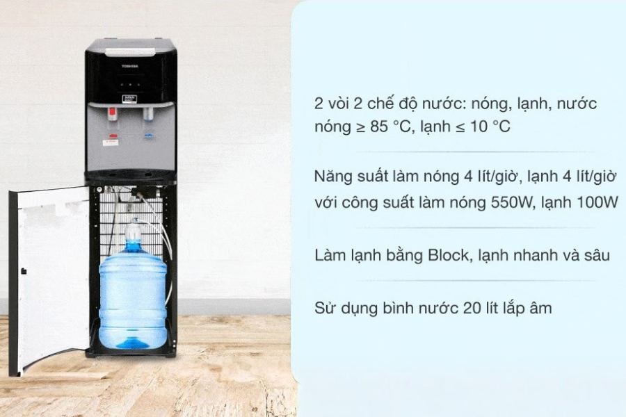 Các thông số trên cho thấy Cây nước nóng lạnh Toshiba RWF-W1669BV(K1) là một thiết bị mạnh mẽ, có khả năng đáp ứng nhu cầu sử dụng liên tục trong gia đình hoặc văn phòng nhỏ. Đặc biệt, việc sử dụng máy nén và bình chứa bằng thép không gỉ là minh chứng cho chất lượng và độ bền vượt trội của sản phẩm.