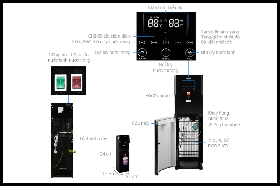 - Thiết kế bình nước âm (dưới máy): Giúp thay bình nước dễ dàng, thẩm mỹ cao và tiết kiệm không gian, phù hợp cho gia đình, văn phòng.
