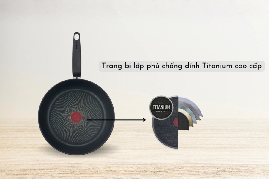 Điểm đột phá tiếp theo nằm ở lòng chảo, nơi được trang bị lớp chống dính Titanium gia cường, giúp bề mặt chảo có khả năng chống trầy xước và bám dính ở mức độ cao nhất. Lớp phủ này không chứa PFOA, chì hay Cadmium, đảm bảo an toàn thực phẩm ngay cả khi lớp chống dính bị tác động bởi nhiệt độ cao trong thời gian dài. Nhờ công nghệ Titanium đặc trưng của Tefal, bạn có thể chiên rán với rất ít dầu mỡ, hỗ trợ lối sống lành mạnh và bảo vệ hệ tim mạch cho cả gia đình hiệu quả. Bề mặt chảo trơn mịn giúp việc vệ sinh sau khi nấu các món như đậu phụ, cá hay trứng trở nên vô cùng nhẹ nhàng và nhanh chóng. Sự kết hợp giữa thân inox 304 kiên cố và lòng chảo Titanium hiện đại đã biến chiếc Chảo chiên inox chống dính Tefal Primary 24cm (E3090404) và các phiên bản khác thành một biểu tượng của sự bền vững. Đây chính là khoản đầu tư thông minh giúp bạn tiết kiệm chi phí thay mới đồ dùng nhà bếp thường xuyên mà vẫn đảm bảo được chất lượng bữa ăn mỗi ngày.