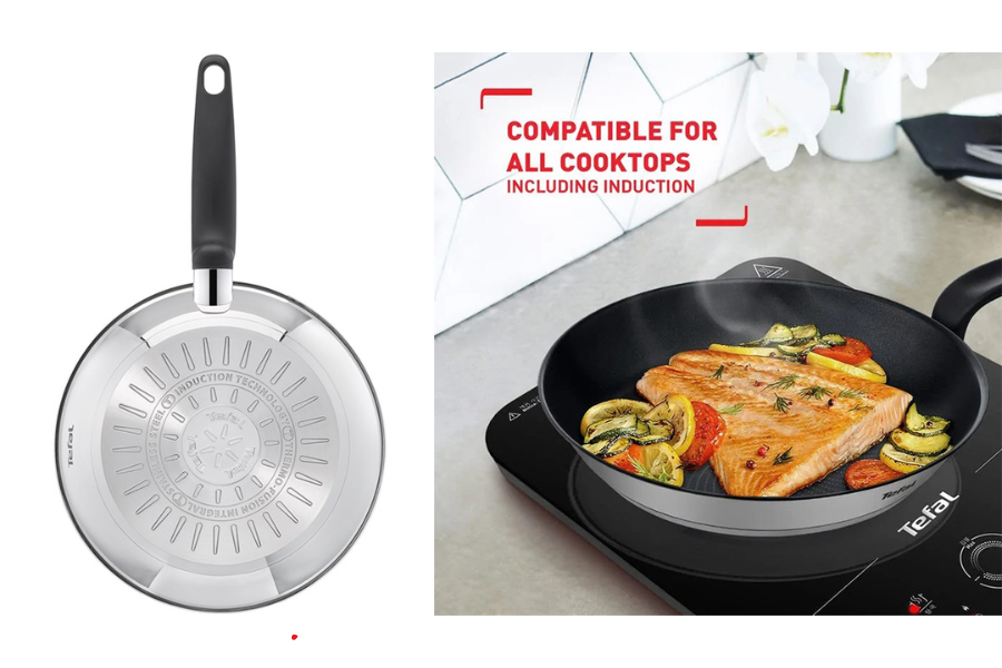 Bên cạnh đó, công nghệ đáy từ đa lớp Thermo-Fusion đóng vai trò là “trái tim” cung cấp nhiệt lượng cho chiếc Chảo chiên inox chống dính Tefal Primary 20/24/26/28cm. Đáy chảo được cấu tạo từ nhiều lớp kim loại ép chặt, trong đó có lớp nhôm nguyên chất giúp truyền nhiệt nhanh hơn gấp nhiều lần so với inox thông thường. Sự phân bổ nhiệt đồng đều từ tâm ra rìa chảo giúp thực phẩm chín đều tại mọi vị trí, khắc phục hoàn toàn nhược điểm “chỗ chín chỗ sống” thường gặp ở các loại chảo đáy mỏng rẻ tiền. Đáy chảo phẳng tuyệt đối và có độ nhiễm từ cao giúp tối ưu hóa hiệu suất trên bếp từ, giúp tiết kiệm điện năng và giảm thời gian đứng bếp mệt mỏi cho người nội trợ. Sự kết hợp giữa Thermo-Signal và Thermo-Fusion mang lại cho bạn sự tự tin tuyệt đối để tạo ra những món chiên rán chuẩn nhà hàng ngay tại căn bếp nhỏ của mình.