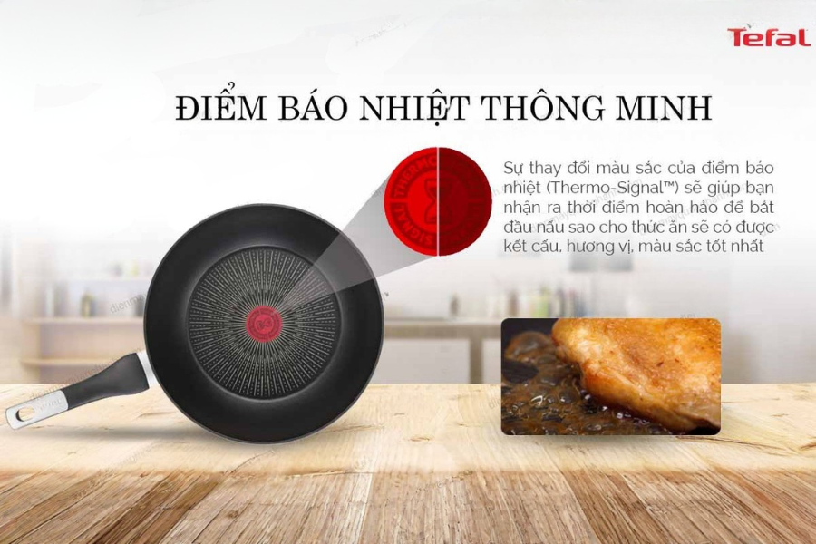 Sự thông minh của Chảo chiên sâu lồng Tefal Unlimited 28cm (G2551902) còn thể hiện qua các công nghệ hỗ trợ nhiệt lượng, giúp người nội trợ không chuyên vẫn có thể nấu ngon như đầu bếp. Công nghệ Thermo-Signal đóng vai trò như một người chỉ dẫn nhiệt độ chính xác, giúp bạn biết được thời điểm vàng để bắt đầu quá trình chế biến. Khi điểm tròn màu đỏ ở giữa lòng chảo biến mất các họa tiết và trở thành màu đỏ thẫm đồng nhất, đó là lúc nhiệt độ đã đạt mức 180°C. Bắt đầu nấu ở nhiệt độ này giúp bề mặt thực phẩm được se lại ngay lập tức, khóa chặt chất dinh dưỡng và nước ngọt bên trong, tạo ra kết cấu món ăn hoàn hảo. Kết hợp cùng hệ đáy Thermo-Fusion, Chảo chiên sâu lồng Tefal Unlimited 28cm (G2551902) thực sự là một thiết bị nấu nướng hiệu suất cao, giúp tối ưu hóa mọi nguồn nhiệt từ bếp từ đến bếp gas.