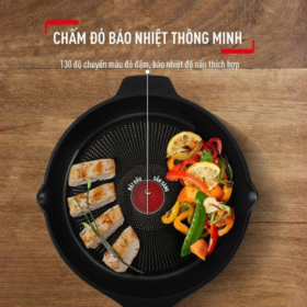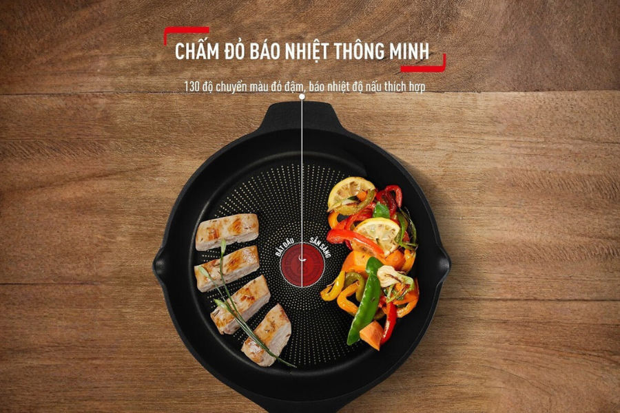 Một trong những công nghệ thông minh độc quyền khiến dòng Chảo đúc cao cấp Tefal Robusto trở nên vô cùng đặc biệt chính là điểm báo nhiệt Thermo-Signal nằm tại tâm lòng chảo. Đây không chỉ là một biểu tượng trang trí mà là một cảm biến nhiệt độ trực quan, giúp người nội trợ xác định chính xác thời điểm “vàng” để cho nguyên liệu vào chảo. Khi chảo đạt đến nhiệt độ lý tưởng (khoảng 180°C), các chi tiết bên trong vòng tròn đỏ sẽ biến mất và chuyển sang màu đỏ đậm đồng nhất, báo hiệu nhiệt lượng đã đủ để bắt đầu quá trình nấu nướng hoàn hảo. Việc nấu ăn đúng nhiệt độ giúp khóa chặt hương vị, giữ lại tối đa vitamin và dưỡng chất quý giá trong thực phẩm, đồng thời ngăn chặn tình trạng thực phẩm bị ngấm dầu do chảo chưa đủ nóng. Thermo-Signal biến công việc nấu nướng từ cảm tính trở thành một quy trình khoa học, giúp ngay cả những người mới tập tành vào bếp cũng có thể tạo ra những món ăn có độ chín và màu sắc chuẩn xác như ngoài hàng.