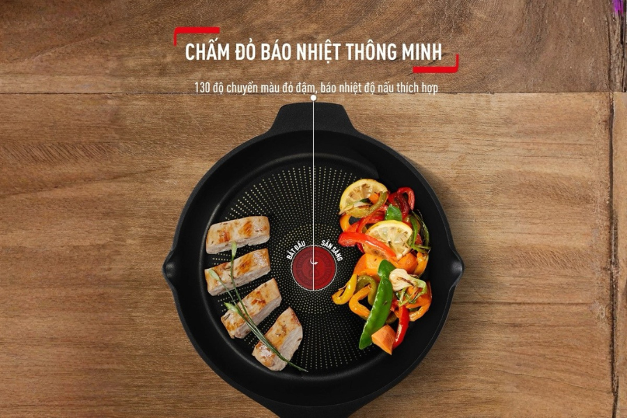 Một trong những công nghệ đột phá khiến người dùng tin tưởng tuyệt đối vào chiếc Chảo đúc sâu lồng cao cấp Tefal Robusto 28cm (E2491944) chính là điểm báo nhiệt Thermo-Signal nằm ngay chính giữa lòng chảo. Đây là công nghệ độc quyền của Tefal, hoạt động như một cảm biến nhiệt độ trực quan: khi chảo đạt đến mức nhiệt lý tưởng khoảng 180°C, các chi tiết bên trong điểm đỏ sẽ biến mất và chuyển sang màu đỏ đậm đồng nhất. Điều này báo hiệu thời điểm “vàng” để bạn bắt đầu cho nguyên liệu vào, đảm bảo thực phẩm được tiếp xúc với nhiệt độ chuẩn xác nhất ngay từ giây đầu tiên. Việc nấu ăn ở nhiệt độ chuẩn không chỉ giúp thực phẩm có lớp vỏ vàng rụm đẹp mắt mà còn giữ lại tối đa các vitamin và dưỡng chất quý giá nhạy cảm với nhiệt lượng. Với Chảo đúc sâu lồng cao cấp Tefal Robusto 28cm (E2491944), bạn không còn phải dùng tay thử nhiệt hay đoán mò, giúp giảm thiểu hoàn toàn tình trạng thực phẩm bị ngấm dầu do chảo chưa đủ nóng.