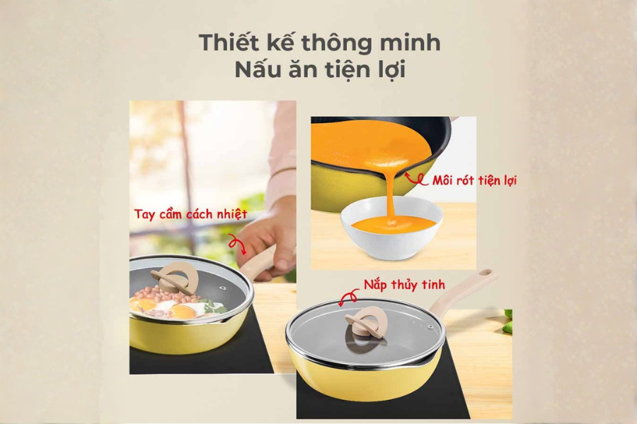 • Cán chảo bọc nhựa Bakelite cách nhiệt giúp người dùng cầm nắm và di chuyển dễ dàng, tránh bỏng tay.