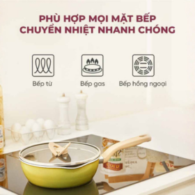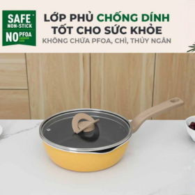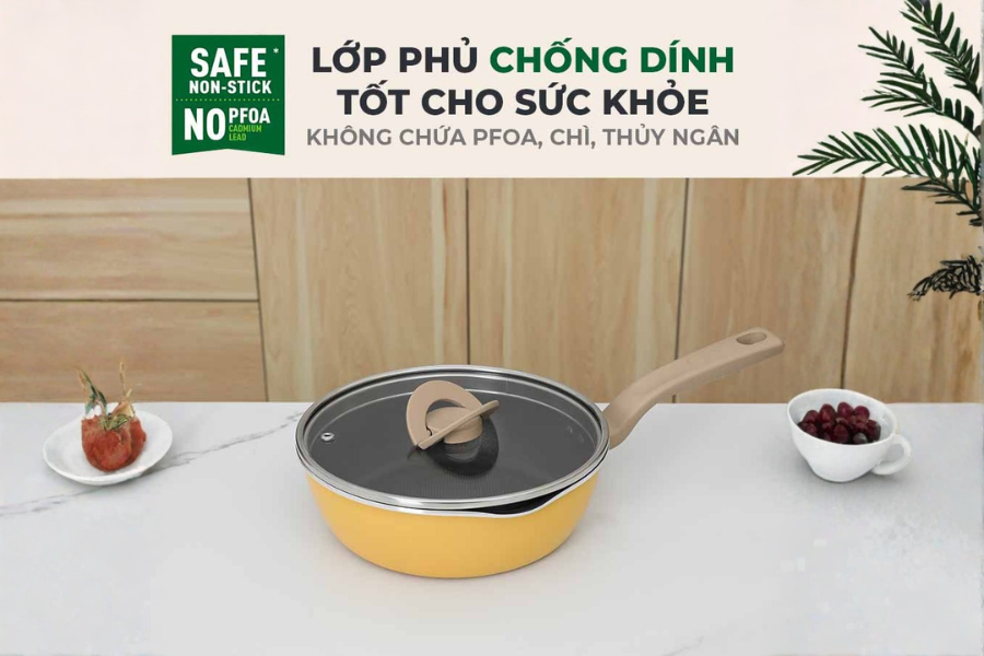 • Lòng chảo phủ chống dính Titanium không chứa PFOA, đảm bảo an toàn sức khỏe, hạn chế thức ăn cháy dính nên dễ dàng vệ sinh.