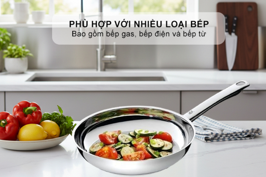 Chảo thép WMF PROFI có thể sử dụng trên nhiều loại bếp khác nhau như bếp gas, bếp điện, bếp hồng ngoại và bếp từ. Điều này mang lại sự linh hoạt tối đa cho người dùng, đặc biệt với những gia đình sử dụng nhiều thiết bị nấu nướng khác nhau.