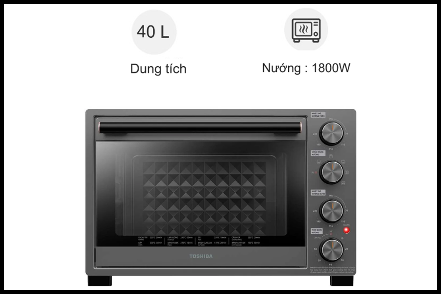 Công suất: Với công suất hoạt động mạnh mẽ (thường dao động trong khoảng 1800W – 2200W tùy chế độ), Lò nướng Toshiba TL-MC40EZF(GR) đảm bảo lò đạt nhiệt độ cần thiết một cách nhanh chóng, rút ngắn thời gian làm nóng sơ bộ (Pre-heat).