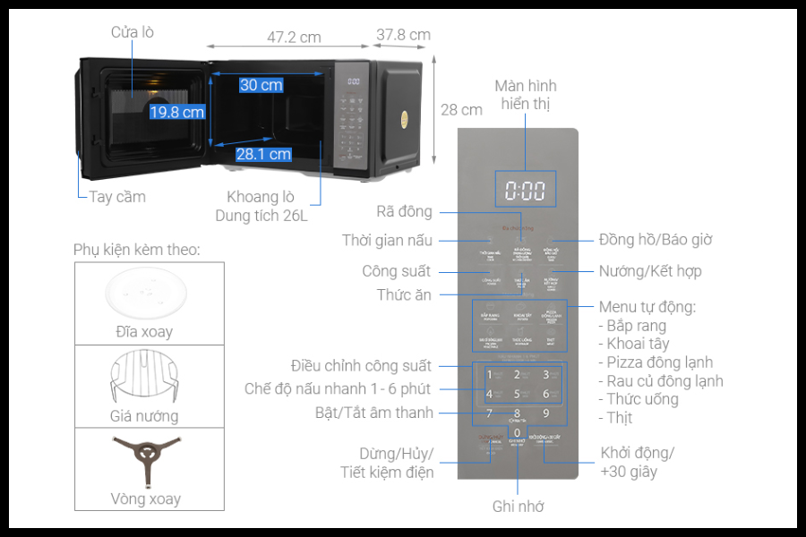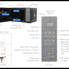 - Dung tích 26 lít cùng công suất vi sóng 800W giúp làm nóng nhanh thực phẩm