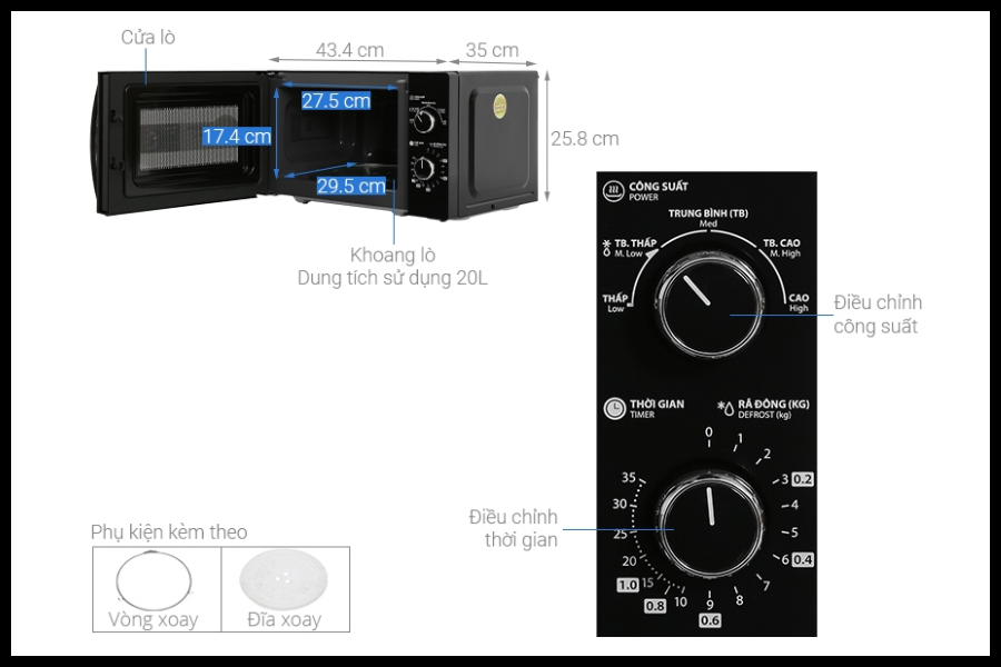 | Đĩa xoay | Thủy tinh chịu nhiệt | Giúp thức ăn được làm nóng đều từ mọi phía. |