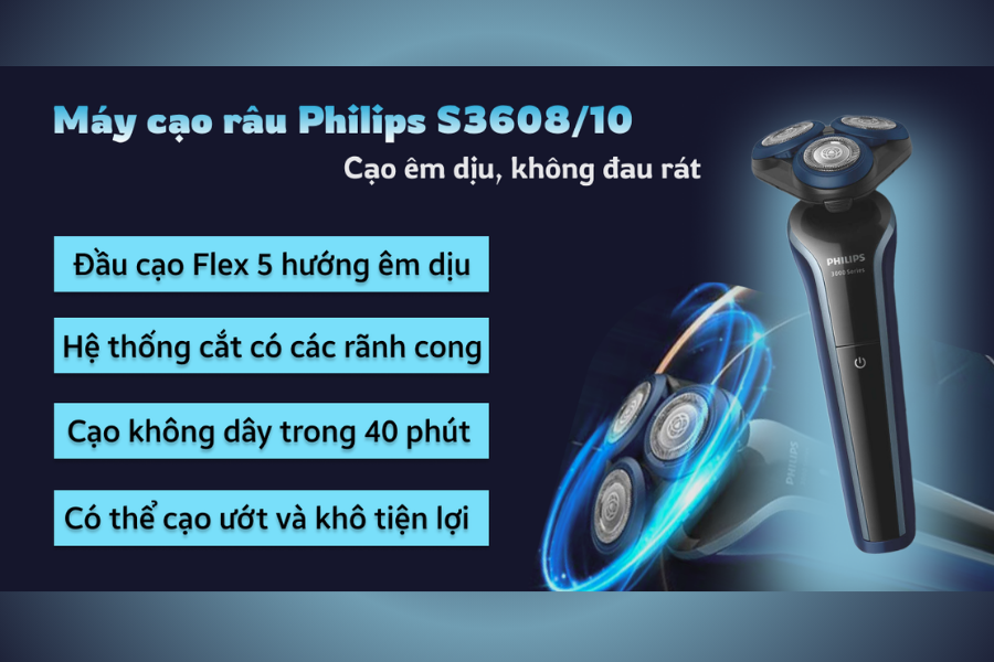- Máy cạo râu khô và ướt Philips S3608/10 phù hợp với nam giới hiện đại cần thiết bị linh hoạt.
