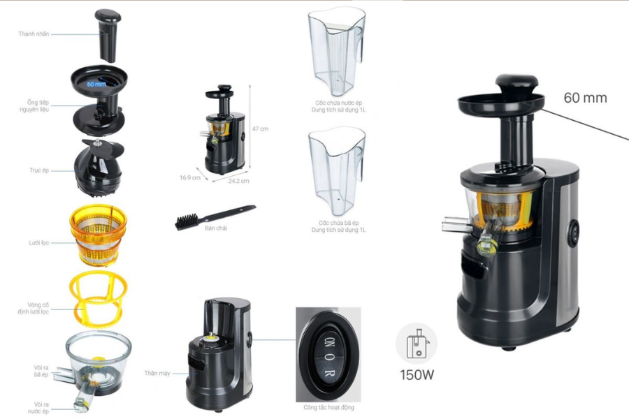 - Thiết kế họng ép 60mm: Phù hợp ép nguyên trái các loại quả nhỏ hoặc rau củ cắt miếng vừa, đi kèm tính năng đảo chiều giúp chống kẹt thực phẩm hiệu quả.