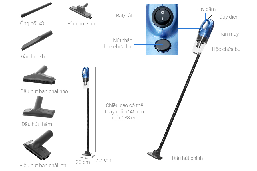 - Thùng chứa bụi lớn, làm bằng nhựa không vỡ