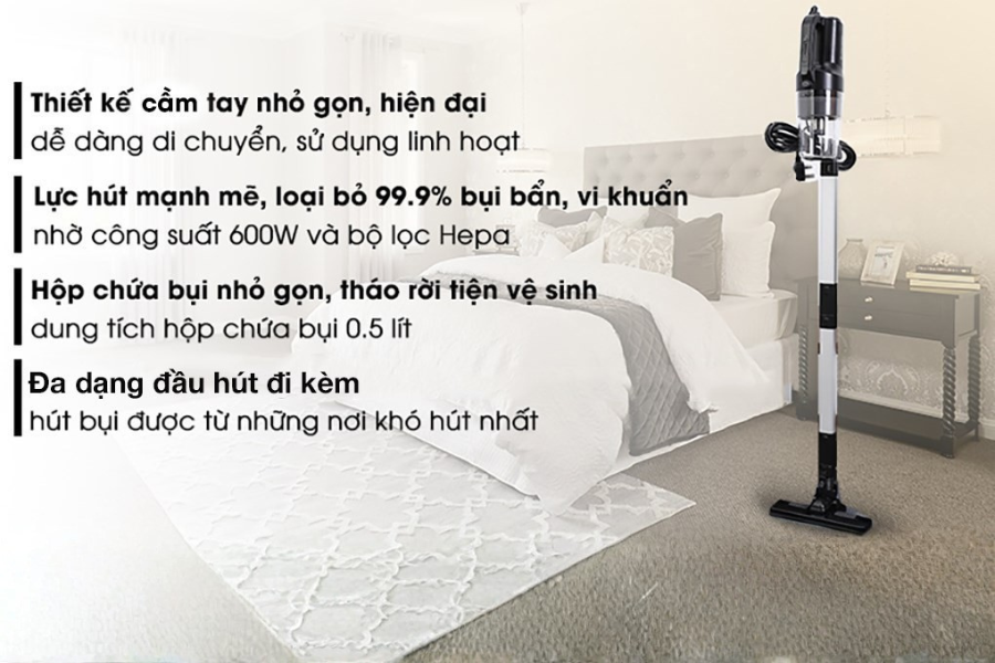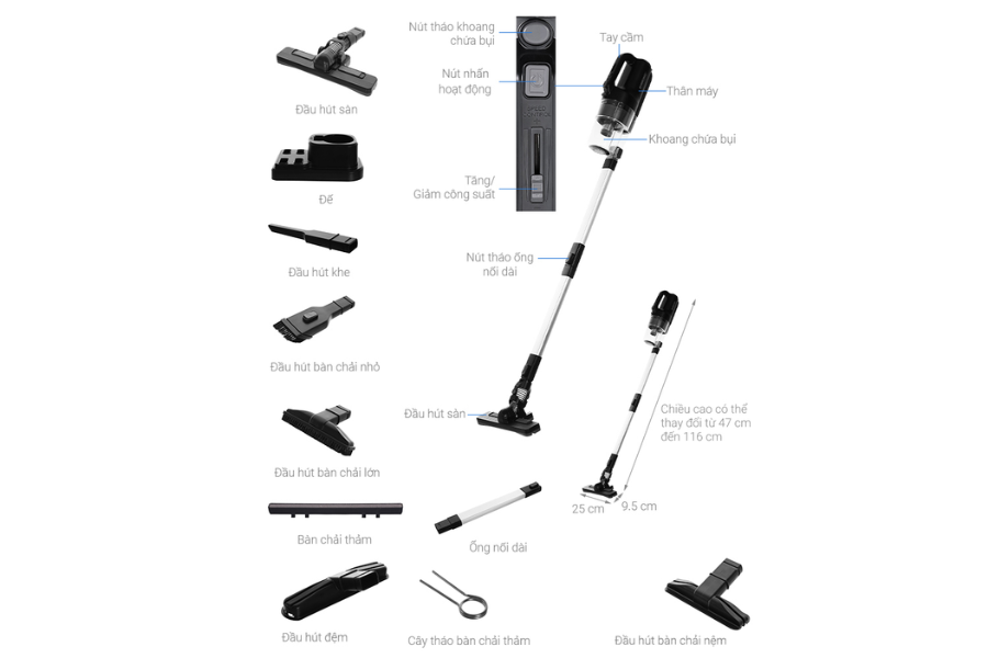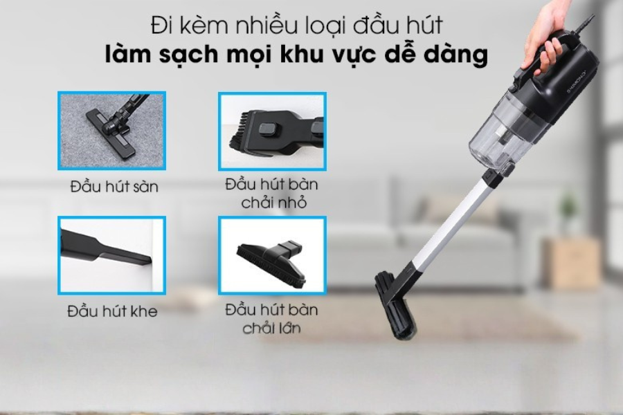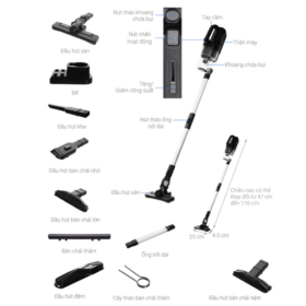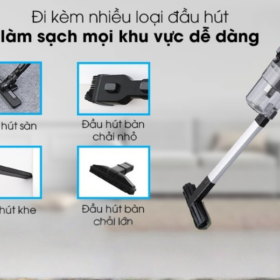 - Đi kèm nhiều phụ kiện như đầu hút bàn chải, đầu hút khe, đầu hút sàn, đầu hút thảm giúp sử dụng tiện lợi, dễ dàng hơn.