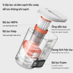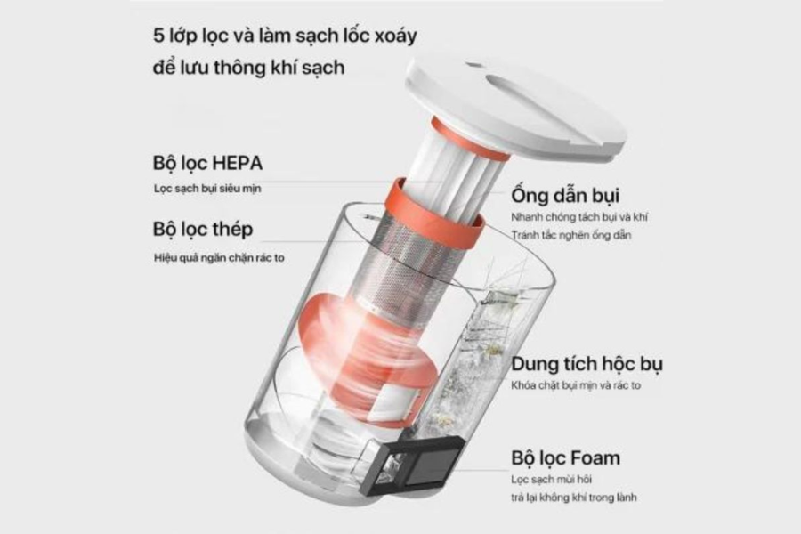 - Hệ thống lọc nhiều lớp gồm bộ lọc thép, foam và HEPA giúp giữ lại bụi mịn, góp phần hạn chế bụi phát tán trở lại môi trường.
