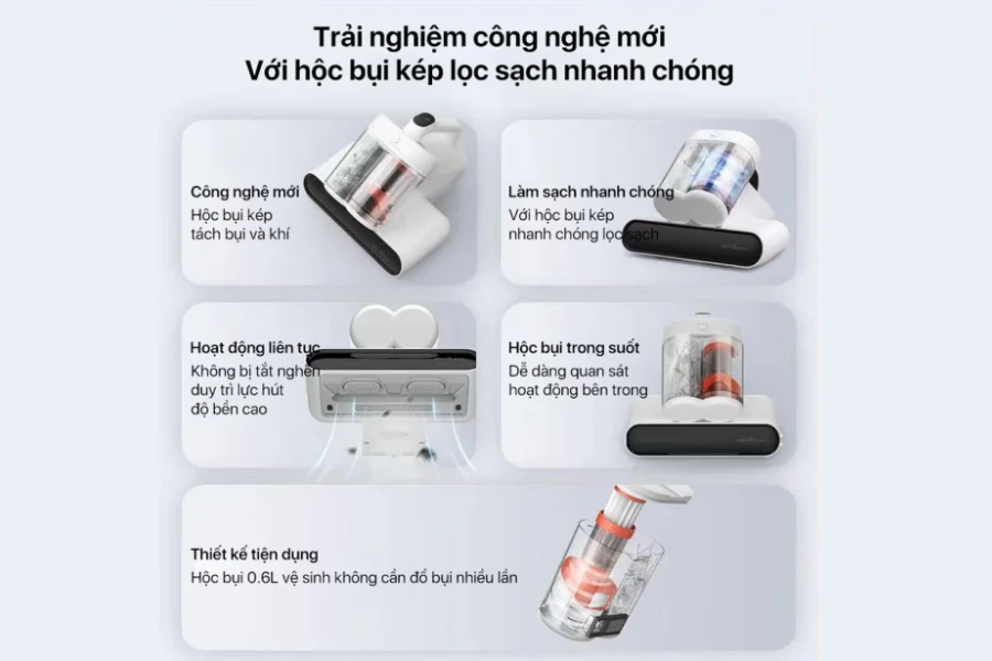 Ngoài ra, Máy hút bụi đệm giường Deerma CM980 trắng còn được trang bị hệ thống lọc đa tầng, giúp giữ lại các hạt bụi siêu nhỏ và hạn chế việc phát tán trở lại không khí. Đây là yếu tố quan trọng đối với những người có cơ địa nhạy cảm hoặc gia đình có trẻ nhỏ. Sản phẩm này cũng hướng đến sự tiện lợi khi sử dụng với thiết kế dây điện dài, dễ di chuyển trong không gian phòng ngủ. Đồng thời, hộp chứa bụi có thể tháo rời nhanh chóng, giúp việc vệ sinh máy trở nên đơn giản hơn. Tất cả những yếu tố này góp phần tạo nên một thiết bị làm sạch chuyên dụng đáng đầu tư.