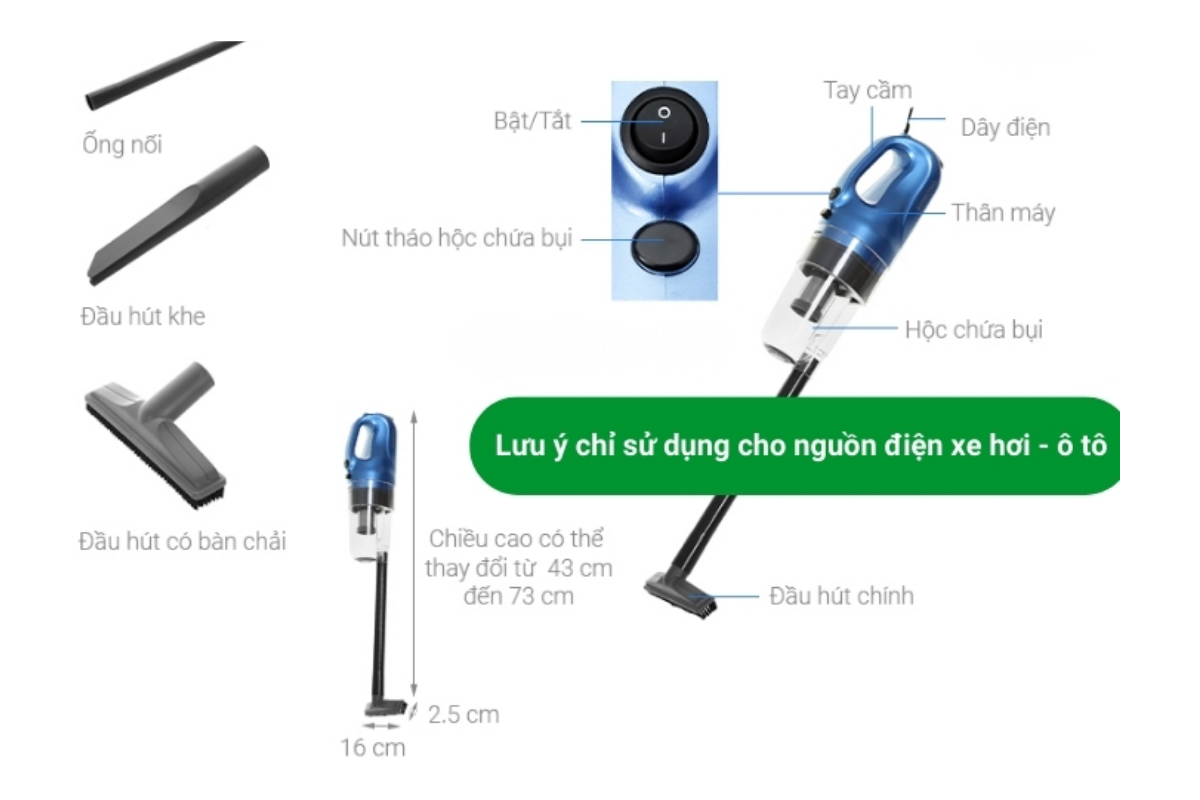 - Công suất hút đủ mạnh để dọn nội thất ô tô