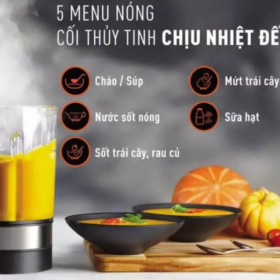 - Máy có một cối lớn thủy tinh và một cối bằng nhựa Tritan cứng cáp