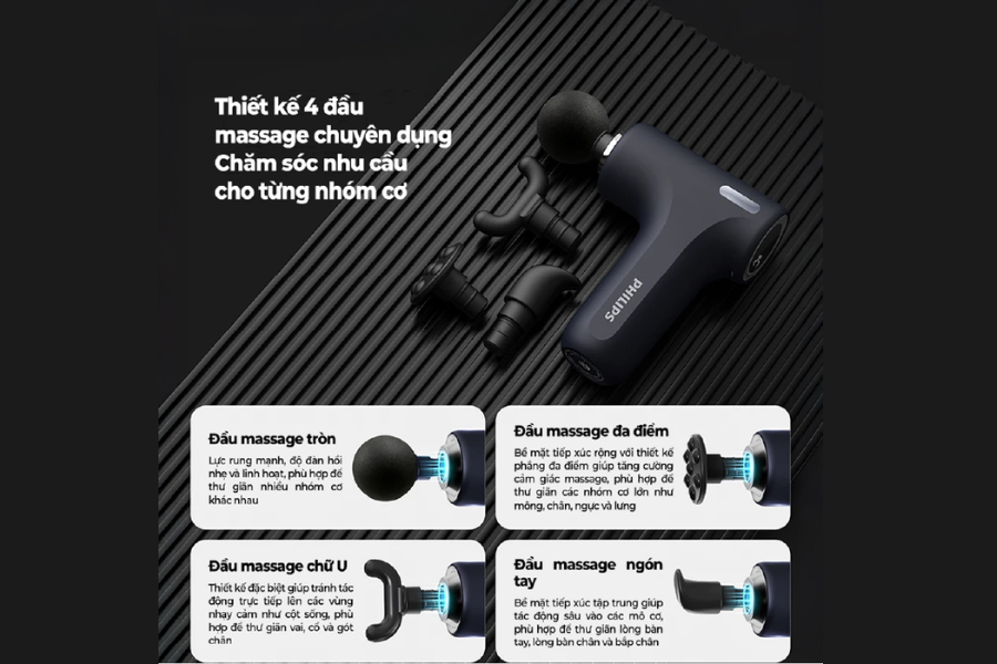 Máy massage cầm tay Philips PPM7319 được trang bị nhiều đầu massage khác nhau, giúp người dùng dễ dàng lựa chọn phù hợp với từng vùng cơ thể. Mỗi đầu massage có thiết kế riêng biệt nhằm tối ưu hiệu quả tác động lên từng nhóm cơ cụ thể. Ví dụ, đầu tròn phù hợp cho các vùng cơ lớn như lưng hoặc đùi, trong khi đầu nhỏ hơn có thể sử dụng cho các vùng như vai hoặc cổ. Sự đa dạng này giúp người dùng tận dụng tối đa công năng của sản phẩm.