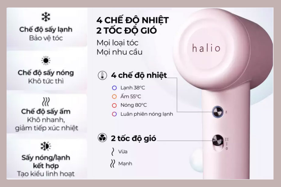Ngược lại, máy sấy tốc độ cao của Halio tận dụng sức gió mạnh, giảm phụ thuộc vào nhiệt, từ đó mang lại hiệu quả sấy tốt hơn mà vẫn an toàn cho tóc.
