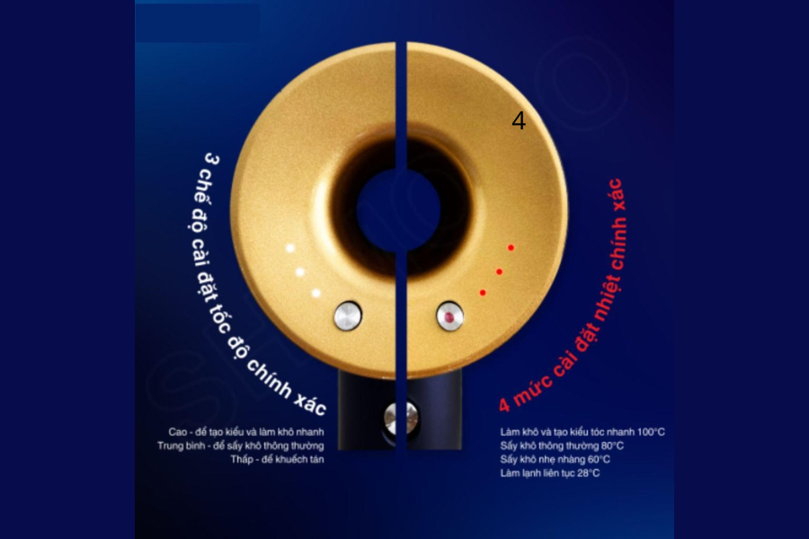 | Điều chỉnh nhiệt độ | 4 mức độ nhiệt (Nóng nhất – Nóng vừa – Nóng nhẹ – Sấy lạnh liên tục) |