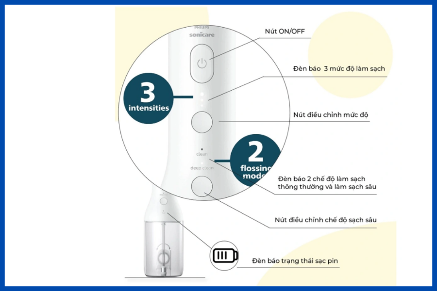 - 3 cường độ làm sạch răng miệng với 2 chế độ xịt rửa kẽ răng.
