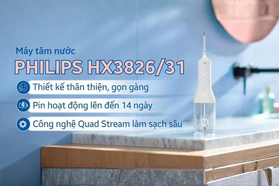 Máy tăm nước Philips HX3826/31 là lựa chọn phù hợp cho những ai muốn nâng cao hiệu quả chăm sóc răng miệng tại nhà.