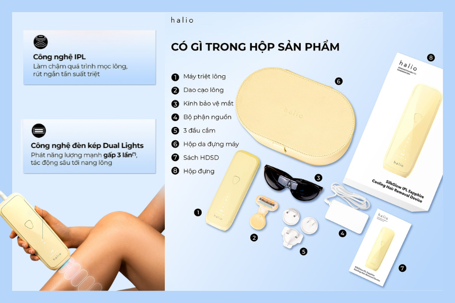 | Tên sản phẩm | Máy Triệt Lông Halio SilkGlow IPL Sapphire Cooling Hair Removal Device |