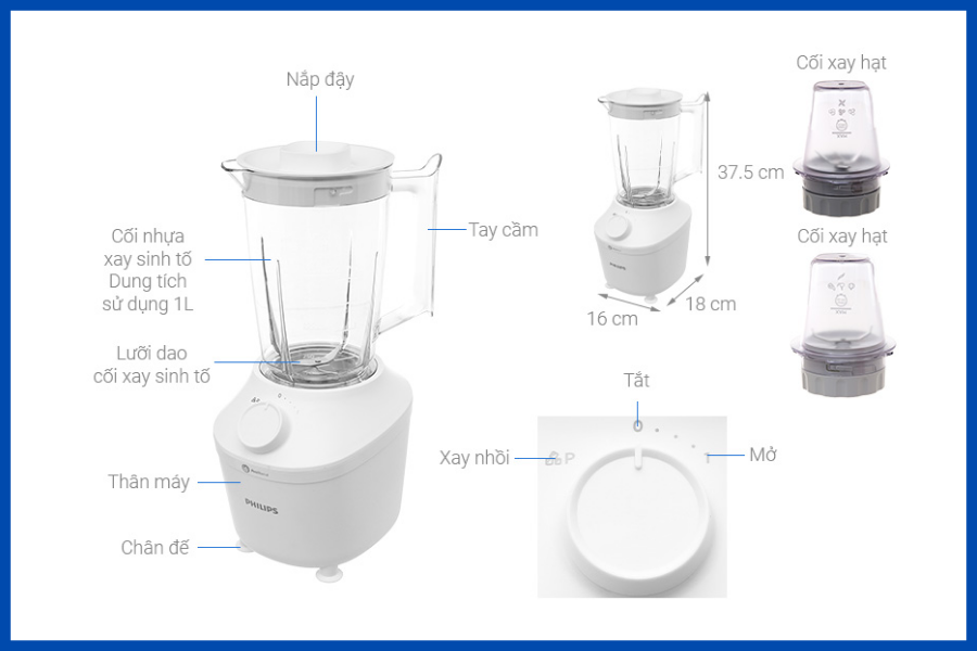 | Chức năng | Xay được đá Xay sinh tố Xay rau củ Xay hạt Xay gia vị: Hành, tỏi, ớt, nấm,… |