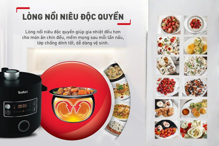 Điểm khác biệt lớn nhất giúp Nồi áp suất điện đa năng Tefal Turbo Cuisine CY754830 5L đánh bại các đối thủ cùng phân khúc chính là lòng nồi dạng hình cầu. Công nghệ này mô phỏng lại cách nấu cơm bằng niêu đất cổ truyền, nơi dòng nhiệt không chỉ đi từ dưới lên mà được luân chuyển 360 độ quanh lòng nồi. Khi nhiệt lượng được phân bổ đồng đều, thực phẩm bên trong Nồi áp suất điện đa năng Tefal Turbo Cuisine CY754830 5L sẽ được làm nóng đồng nhất, loại bỏ tình trạng bên ngoài quá chín nhưng bên trong vẫn còn sượng. Lòng nồi được cấu tạo đa tầng với lớp phủ chống dính Ceramic cao cấp, giúp thức ăn không bị bám dính và hạn chế tối đa việc sử dụng dầu mỡ. Điều này không chỉ giúp món ăn thơm ngon hơn mà còn bảo vệ sức khỏe tim mạch cho cả gia đình bạn. Việc vệ sinh lòng nồi sau khi nấu cũng trở nên nhẹ nhàng, giúp người nội trợ có thêm nhiều thời gian để nghỉ ngơi và chăm sóc bản thân.