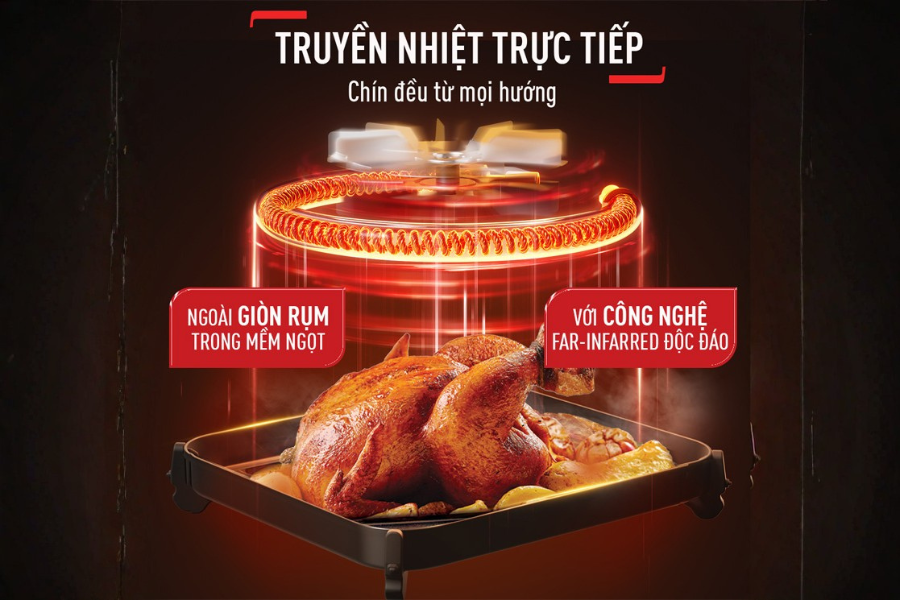 - Công suất 1550 – 1835W kết hợp công nghệ tia hồng ngoại xa truyền nhiệt trực tiếp, món ăn chín nhanh, giảm thời gian chờ và giữ độ giòn bề mặt tốt hơn.