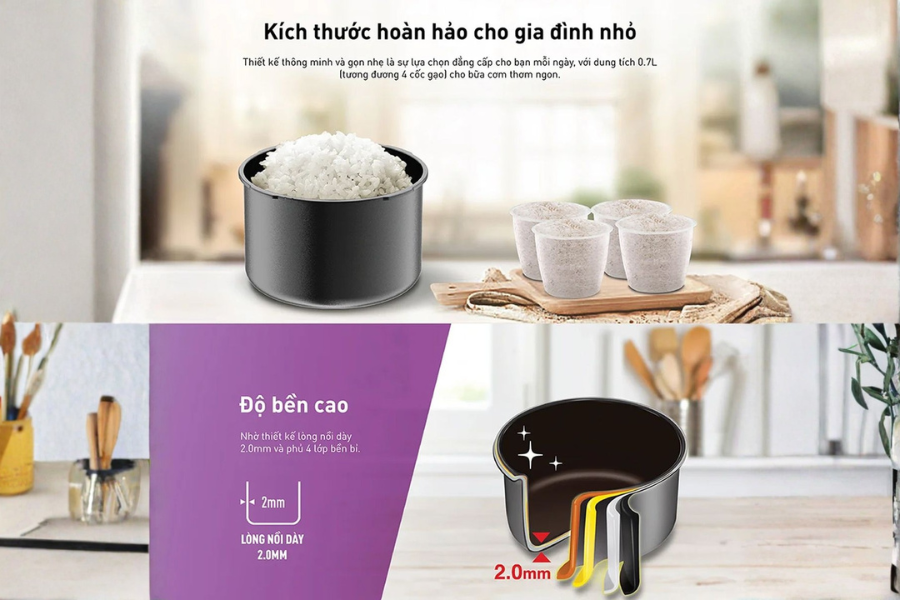 Trong cuộc sống hiện đại, không phải gia đình nào cũng cần một chiếc nồi cơm dung tích lớn. Với những người sống một mình, sinh viên ở trọ hoặc các cặp vợ chồng trẻ, một chiếc nồi nhỏ gọn nhưng vẫn đảm bảo cơm chín ngon và tiết kiệm điện là lựa chọn hợp lý hơn cả. Nồi cơm điện cơ mini Tefal RK224168 – 0.7L – 300W ra đời nhằm đáp ứng chính xác nhu cầu đó, mang đến sự tiện lợi trong từng bữa ăn hằng ngày. Thiết kế tinh tế, công suất vừa phải và cơ chế vận hành đơn giản giúp việc nấu cơm trở nên nhẹ nhàng hơn bao giờ hết. Đây là mẫu nồi cơm điện mini đang được nhiều người tiêu dùng quan tâm khi tìm kiếm giải pháp nấu cơm cho không gian nhỏ.