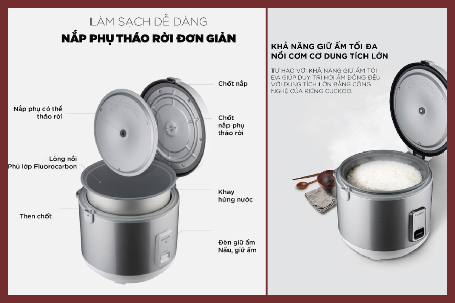 Thiết kế cơ học đơn giản giúp Nồi cơm điện Cuckoo CR-1420/SIVNCV ít phát sinh lỗi kỹ thuật, đồng thời thuận tiện trong việc bảo trì. Việc vệ sinh định kỳ van thoát hơi và lau sạch thân nồi sẽ giúp sản phẩm duy trì hiệu suất ổn định trong thời gian dài.