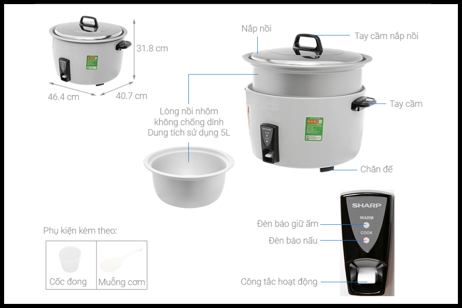 Nồi cơm điện Sharp KSH-D55V là một trong những sản phẩm nổi bật trong phân khúc này khi đáp ứng tốt cả về hiệu suất nấu lẫn độ bền sử dụng. Sản phẩm phù hợp với gia đình đông người, quán ăn nhỏ hoặc bếp tập thể cần một thiết bị nấu cơm đáng tin cậy.