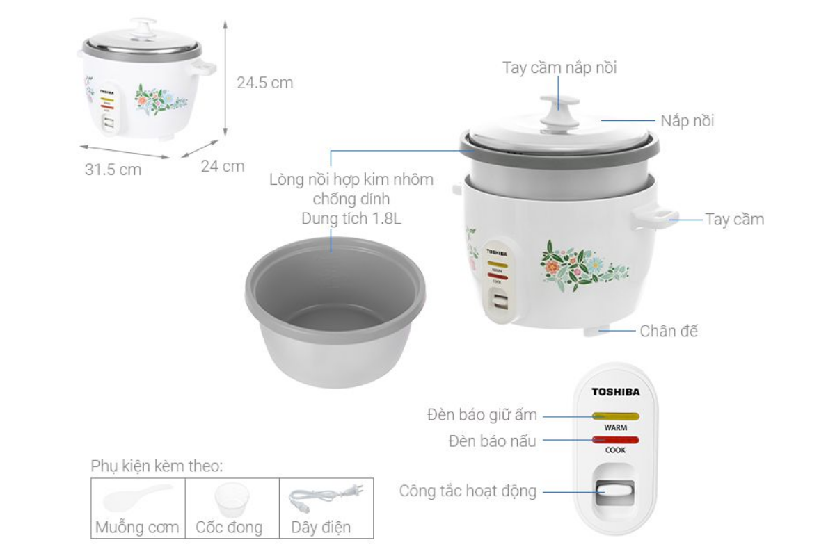 I. Khám phá chi tiết thiết kế và dung tích ưu việt của Nồi cơm điện Toshiba RC-18MH1PV(F)