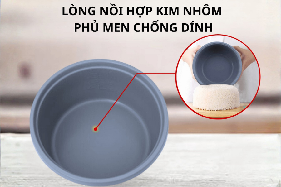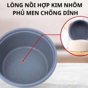 - Lòng nồi chống dính: Lòng nồi là bộ phận quan trọng nhất, được chế tạo từ hợp kim nhôm cao cấp, có độ dày tiêu chuẩn giúp truyền nhiệt nhanh và giữ nhiệt lâu. Bề mặt lòng nồi được phủ lớp chống dính bền bỉ, an toàn cho sức khỏe (đã được kiểm định), ngăn chặn tình trạng cơm dính cháy, giúp cơm chín đều, thơm ngon và việc vệ sinh sau khi sử dụng trở nên cực kỳ đơn giản.
