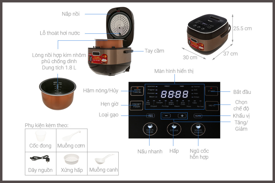 • Nhiều chế độ nấu: cơm trắng, gạo lứt, cháo, hấp, làm bánh…