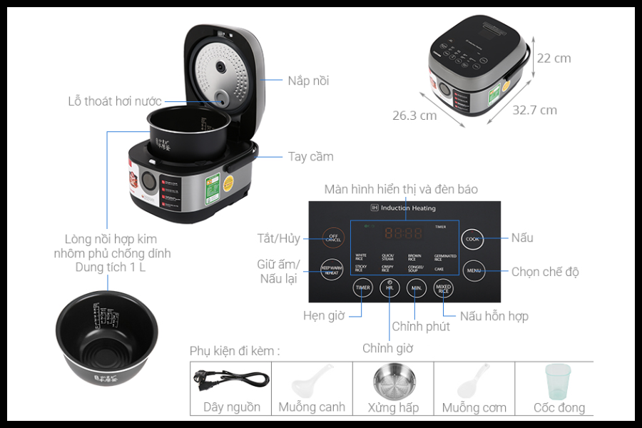 • Công nghệ cao tần IH 1000W giúp cơm chín đều, thơm ngon