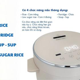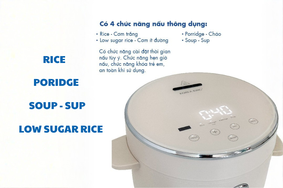 • Có 4 chức năng nấu thông dụng: Rice-Cơm trắng, Low sugar rice-Cơm ít đường và Porridge-Cháo, Soup-Sup