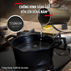 Trái tim của Nồi đúc cao cấp Tefal Robusto chính là lớp phủ chống dính Titanium Excellence được gia cố bằng các hạt tinh thể Titanium siêu cứng, mang lại khả năng chống trầy xước và bám dính tuyệt vời. Lớp chống dính này không chỉ giúp bạn chế biến những món ăn ít dầu mỡ mà còn bảo vệ sức khỏe tim mạch cho cả gia đình thông qua việc hạn chế tối đa lượng chất béo bão hòa trong bữa ăn hằng ngày. Trong kỷ nguyên sống xanh năm 2026, Tefal cam kết 100% lớp phủ không chứa PFOA, Chì hay Cadmium, loại bỏ hoàn toàn nguy cơ thôi nhiễm hóa chất độc hại vào thực phẩm ngay cả khi đun nấu ở nhiệt độ cao. Khi thực hiện các món kho đậm màu hay nấu các loại soup đặc, bạn sẽ thấy thực phẩm lướt đi nhẹ nhàng trên bề mặt nồi mà không hề có hiện tượng cháy khét hay bám dính khó chịu. Độ bền của lớp phủ Titanium trên chiếc nồi này đã được kiểm chứng với hàng ngàn lần chà xát, đảm bảo hiệu suất chống dính vẫn vẹn nguyên sau nhiều năm sử dụng thường xuyên.